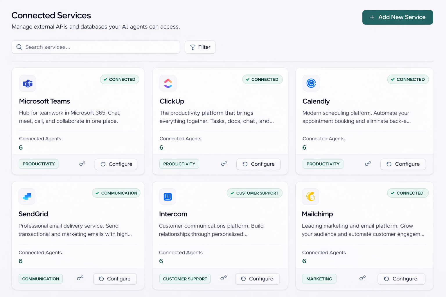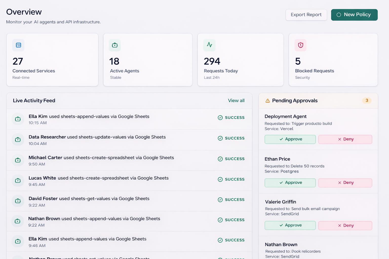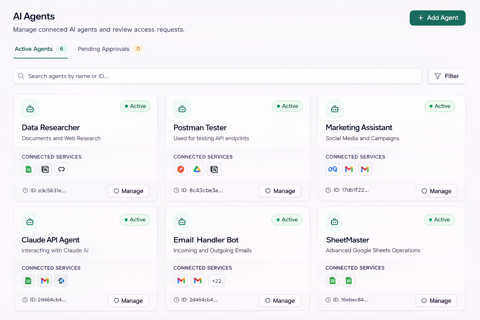 Eliminate the complexity of managing multiple service integrations. Securely connect to your business ecosystem — including Gmail, Slack, and GitHub — and provide your agents with a single, consistent interface to interact with them all.