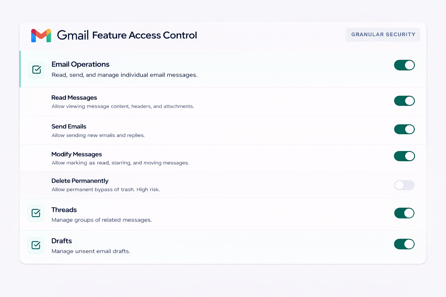 Take absolute control over what your agents can and cannot do. Define granular capabilities at the method level—allow 'Gmail Read' but block 'Gmail Delete' with a single toggle. Stow enforces these policies before a single byte reaches your third-party APIs.